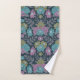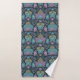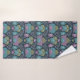 Cette serviette de bain présente des fleurs dans les tons violet, bleu et vert olive entourées de frondes de fougère violette et muettes et de feuilles sur un arrière - plan bleu foncé.