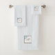 Bande bleue classique et fleur de lis motif avec monogramme de police de script en taupe foncé, ensemble de serviettes monogramme de bain monogramme. Personnalisez avec votre propre initiale. Conçu pour correspondre à notre collection de fleur de lis classique.
