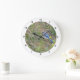 Cette horloge présente une photo d'un Blue Jay aux couleurs vives profitant d'un buisson Southern Wax Myrtle, pris dans l'habitat faunique du Jardin certifié de l'artiste.