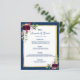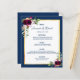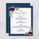 Une élégante carte de menu mariage de style bohème. Plumes et roses luxuriants en bordeaux. Modèles pour vos noms, date et le menu mariage. Un cadre en faux or et un arrière - plan chic bleu marine et blanc. Lettres bleu marine. Retour : arrière - plan bleu marine.