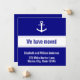 Cette faire-part en mouvement bleu marine a une ancre blanche en haut. Au centre, il y a du texte personnalisé (texte d'affichage : nous avons déplacé) que vous pouvez modifier à votre message souhaité. En bas, vous pouvez personnaliser votre faire-part mobile avec votre nom et votre nouvelle adresse.