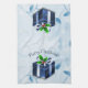 Ajoutez une touche de vacances à votre cuisine avec cette serviette de cuisine cadeau de Noël bleu. Le design des serviettes comprend un cadeau de Noël bleu vif orné de baies sèches et de flocons de neige tombant contre un élégant parchemin et arrière - plan feuille. Autres cadeaux et objets de vacances disponibles avec ce design aussi.