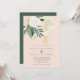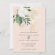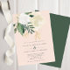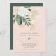 Une faire-part de mariage moderne et romantique. Ce design présente une cascade de roses d'aquarelle en blanc et ivoire, de feuilles verts et un dépoussiérage de fausse parties scintillant, sur un arrière - plan blush. L'inverse est en vert foncé solide. Ce mélange de rose pâle et de vert foncé rend cette invitation parfaite quelle que soit la saison de votre grande journée prévue.