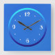 Une horloge bleue simple avec des chiffres blancs. Ce design d'horloge simpliste a un anneau aqua et bleu foncé entourant les chiffres. Disponible en formes carrées et rondes. Convient pour votre propre cuisine ou toute autre pièce de la maison. Également recommandé comme cadeau pour des occasions spéciales.