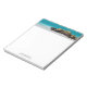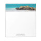 Bloc-notes avec une belle photo. Une plage de sable blanc, au surf doux. Une eau tropicale turquoise entoure un rocher déchiqueté.