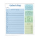 Un bloc-notes pratique pour vous aider à suivre vos habitudes quotidiennes, à boire assez d'eau, à vous étirer au moins une fois par heure pendant une journée de travail de huit heures, à prendre le nombre d'étapes dont vous avez besoin, et à vous rappeler de prendre vos médicaments ou vitamines! Il y a aussi une liste de choses à faire pratique avec dix cases à cocher pour que vous puissiez faire votre liste de tâches quotidiennes et cocher chaque tâche que vous avez terminée. En haut, ajoutez votre nom dans une police bleue en gras. Le suivi quotidien des habitudes est imprimé dans différentes nuances de bleu et de vert, d'un bleu ciel clair à vert olive.