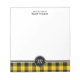 Tampon de note personnalisé avec bordure plaid et monogramme. Motif écossais traditionnel en plaid jaune vif et noir, avec des accents rouges.