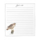 A brown and tan feathered hawk perched on tree stump saying "Just a note."