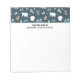 A notepad with a whimsical festive pattern. Polar bears, reindeers, trees. foxes, and snowflakes. On a dark green background.