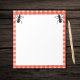 Ce bloc-notes est blanc avec une bordure en plaid rouge et blanc qui ressemble à une nappe de pique-nique avec deux grosses fourmis noires amusantes en haut.