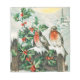 Vintage Christmas Illustratation of two little robins sitting on a fence with holly berries in the snow.