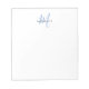 Élégant Bloc-notes moderne blanc Script Monogramme. Un élégant monogramme de script bleu combiné à une police de caractères noir propre san-serif donne un look contemporain. Bordure mince au verso de la carte de note.