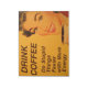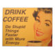 Femme souriante avec rouge à lèvres rétro et ongles boit sa tasse de café du matin. La légende dit : "Buvez du café - Faites des choses stupides plus vite avec plus d'énergie."