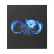 Luminous infinity symbol with glowing, beautiful, lushly blooming rose made of blue flames on black background.