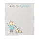 Personalize this notepad for a little boy, with name. Designed in gray with little boy stick dressed in green, and gray, with yellow stars.