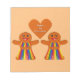 This awesome notepad features a digital art image of a cute gingerbread Lesbian couple. The gingerbread ladies have pretty eyelashes and wear red lipstick. They have fringed skirts and tops on. The fringing on their clothes matches the colors of the pride flag. Both have a big smile. There is a gingerbread heart above the couple showing their love for each other.
