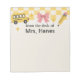 Éclaircissez votre classe ou votre bureau avec ces notes collantes à la mode de l'enseignant! Doté d'un damier jaune ludique, d'un arc rose, d'un autobus scolaire joyeux, de crayons et d'une fleur souriante, ce bloc-notes est à la fois fonctionnel et amusant. Le design inclut "From the desk of [Your Name]" pour une touche personnalisée tout en laissant beaucoup d'espace blanc pour les rappels, les notes aux étudiants, ou les mémos rapides. Un cadeau parfait pour l'appréciation des enseignants, l'essentiel de retour à l'école, ou l'accessoire de classe personnalisé - sûr de rendre les notes d'écriture extra mignon et professionnel!