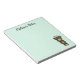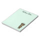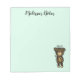 Un bloc-notes avec une simple illustration d'un ours brun caricaturé tenant une marguerite jaune. Bonjour écrit au-dessus de sa tête. Placé sur un arrière - plan vert pâle.