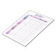 Ce bloc-notes personnalisable est parfait pour garder votre horaire hebdomadaire organisé et en bonne voie. Avec ses tons violets et roses et ses lignes en grille blanche, il est à la fois fonctionnel et élégant. Le planificateur est divisé en 7 colonnes, une pour chaque jour de la semaine, avec des créneaux horaires de 7h à minuit. Gardez votre vie en ordre avec ce bloc-notes pratique! 😊