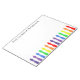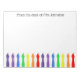 Ce bloc-notes lumineux et coloré est conçu pour un professeur, et a les mots : Du bureau de ... Vous pouvez le personnaliser avec n'importe quel nom. Le coussin est blanc et décoré d'une rangée de brosses d'artiste le long du fond dans les couleurs arc-en-ciel. il est amusant et amusant.