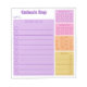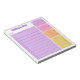 Un bloc-notes pratique pour vous aider à suivre vos habitudes quotidiennes, à boire assez d'eau, à vous étirer au moins une fois par heure pendant une journée de travail de huit heures, à prendre le nombre d'étapes dont vous avez besoin, et à vous rappeler de prendre vos médicaments ou vitamines! Il y a aussi une liste de choses à faire pratique avec dix cases à cocher pour que vous puissiez faire votre liste de tâches quotidiennes et cocher chaque tâche que vous avez terminée. En haut, ajoutez votre nom dans une police violette en gras. Le suivi quotidien des habitudes est imprimé en blocs de couleur rose, violet, orange et jaune.