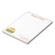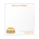 Ce bloc-notes présente une délicieuse illustration de dessin animé d'un hamburger. Le hamburger est fait de viande, laitue verte, tomates rouges, oignon, tranche de fromage et quelques cornichons. Le petit pain a l'air frais et il y a des graines de sésame sur le dessus. Il existe également des zones de texte personnalisables pour le nom d'entreprise et d'autres informations.