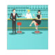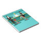 Every hour is happy hour with this Retro Cocktail Lounge Notepad. The mid century modern design features a vibrant, 1960's style, minimalist, cartoon drawing of a classy, cocktail bar. Against the backdrop of an aqua wall, we can see rows of drink glasses. At least we can see the teal silhouettes of drink glasses. Judging from the shapes of the stemware, this bar is well equipped to wet your whistle, whatever your drink preference. A most competent and personable bartender is manning the teal bar with yellow accents. The young barkeep is wearing a pristine, white shirt with black bow tie. His fresh-faced good looks, blond hair and black hipster glasses give us every reason to believe that he either spends his days as a struggling actor or a superhero. In one hand, the handsome mixologist is handing a martini to a customer on the opposite side of the bar. The waiting customer is a broad-shouldered gentleman in a black suit and red tie. He's the sort of fellow who is described as tall, dark, and handsome even when it's still hours until closing time. There seems to be a red and chrome bar stool with Mr. Debonair's name on it. Yet, not to be presumptuous, he asks the question, "Pardon me. Is this seat taken?" He is asking the raven haired gal on the neighboring bar stool. She's a real "girl next door" type, if you happen to live next door to a flawless beauty with a figure that won't quit. She is wearing a black dress and holding a martini in one hand. She's hoping that she and the approaching gentleman have more in common that their drink preference and choice of wardrobe color. It looks like this evening just got interesting. Cheers to you!