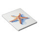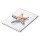 An illustration of an orange starfish that seems to be relaxing on its blue silhouette. Watercolor drawing.