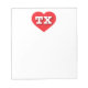 Ce carnet de notes de mémo contient un coeur rouge vif contenant les lettres coques TX, en gras, blanches, en haut, l'abréviation officielle de l'état du Texas, l'état étoilé solitaire.