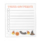 Le design du bloc-notes Checklist comprend des illustrations originales d'un citrouille, d'une chauve-souris, d'un fantôme, d'un casquette sorcier et d'un bonbon de maïs, avec TRICK OU TREAT dans une police orange amusante. Idéal pour Halloween. De nombreux autres blocs-notes illustrés sont également disponibles dans cette boutique. Cette conception est également disponible sur d'autres produits. Ne vois-tu pas ce que tu cherches ? Vous avez besoin d'aide pour la personnalisation ? Contactez Rebecca pour avoir quelque chose conçu pour vous.