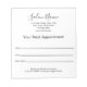 Ce rappel de rendez-vous pour salon de beauté indique "Votre Prochain Rendez-vous" et comporte des lignes pour la date et l'heure du rendez-vous ainsi que le nom du styliste. En bas, il y a un texte affiché que vous pouvez modifier pour créer un message personnalisé si vous le souhaitez. (Illustré : Veuillez fournir un préavis de 24 heures si vous n'êtes pas en mesure de maintenir votre rendez-vous.) Un texte supplémentaire est situé près du haut pour le nom du salon et son adresse, son numéro de téléphone et son site web. Tout le texte peut être modifié ou supprimé. Le texte est noir.