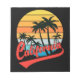 Bloc-notes californien avec un design rétro qui dispose d'un coucher de soleil et de palmiers sur arrière - plan noir (personnalisable couleur bg). Cette conception a également la Californie dans une police manuscrite avec un glyphe de queue d'escroc pour ce look rétro élégant. Ce bloc-notes est fait pour vous si vous êtes de Californie ou vous pouvez obtenir comme un cadeau ou un souvenir pour quelqu'un.