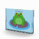 Cette mignonne grenouille verte et joyeuse assise sur un coussin de lys violet est lumineuse et adorable. Beaucoup d'amusement amphibien dessiné dans un joyeux style de dessin animé.