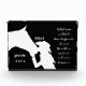 Bloc photo du mémorial du cheval avec des noms personnalisés et une citation à l'arrière : "Alors que le temps s'estompera, ces sabots... ceux que tu as laissés sur mon coeur... ne disparaîtront jamais." Dessin vectoriel de cheval et de fille. Cowgirl occidentale art vectoriel silhouette noir et blanc pour les amateurs de chevaux. Cadeau de cheval personnalisé.