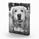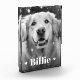 Bloc photo avec votre photo d'animal de compagnie personnalisée avec le nom de l'animal comme un texte blanc recouvert de deux coeurs.