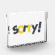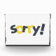 Design graphique moderne, ludique, dynamique d'un mot "Désolé" dans les couleurs jaune et gris. Une typographie urbaine, simple.