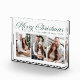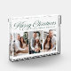 Bloc photo moderne avec "Joyeux Noël" dans un élégant script de calligraphie verte avec un arrière - plan blanc. Le bloc photo comprend 3 de vos photos verticales préférées. Personnalisez le bloc photo en ajoutant votre nom de famille et l'année.