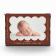 Bloc photo faire-part de naissance simple et moderne avec photo de votre bébé niché à l'intérieur d'un cadre à pétoncles marron. Personnalisez le bloc photo en ajoutant le nom de votre bébé et des informations supplémentaires en lettres blanches.