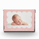 Bloc photo simple et moderne avec la photo de votre bébé niché à l'intérieur d'un cadre rose vermillon. Personnalisez le bloc photo en ajoutant le nom de votre bébé et des informations supplémentaires en lettres blanches.