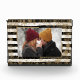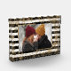 Des flocons d'or et des points sur des rayures noires et blanches soulignent votre photo préférée sur ce bloc photo acrylique. Idéal comme cadeau ou pour afficher votre photo préférée dans votre propre maison. *Mise en page VERTICALE faite pour vous dans notre magasin.