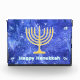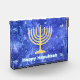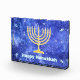 Une menorah Hanoukka en or brillant et un texte "Happy Hanoukka" en bleu et blanc brillant superposé sur une image fractale bleue et blanche qui rappelle les flocons de neige dans une tempête. Chag Sameach !