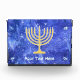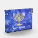 Une menorah Hanoukka dorée superposée sur une image fractale bleue et blanche qui rappelle les flocons de neige dans une tempête. Ajoutez votre propre texte. Chag Sameach !