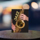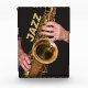 Bloc photo acrylique pour affichage qui présente l'image photo d'un jazzman jouant sa corne de saxophone ténor, de couleur or usée, avec le mot "JAZZ" imprimé en lettres de blocs de couleur or. Un grand cadeau pour tous les fans de jazz !