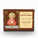 Pour les 1ers Communicants + Dans cette splendide image, Jésus est assis à une table qui est dressée pour la Pâque et recouverte d'un chiffon bleu et blanc. Il est vêtu d'un vêtement rouge doux et accrocheur. C'est Maundy ou Jeudi Saint et Sa Dernière Cène avec Ses apôtres. C'est le moment où Il institue le sacrement de la Sainte Communion ou de l'Eucharistie. + La figure de Jésus est isolée d'un arrière - plan rouge foncé à motifs d'artichauts stylisés en forme de losange. L'humeur ici est solennelle. Laissant ses yeux au ciel, Jésus lève sa main droite en bénédiction. À sa gauche, Il tient une grande hôte, le pain eucharistique, sur le chalet rempli de vin. En latin, dans un banderole sous la scène, sont les mots de la consécration : "This is My Body.. This is My Blood" ("Hoc est corpus meum... Hic est sanguis meus"). En souvenir de Lui, à chaque messe, le prêtre réagit à cette action sacrée qui transforme le pain et le vin ordinaires en Corps et Sang du Christ. + Crédit d'image (SAU 045) : Impression dévotionnelle antique de Jésus Instituting the Holy Eucharist, publiée à l'origine dans la chromolithographie par la Socièté de St. Augustin, Bruges, Belgique, fin 19ème siècle, de la collection privée de l'architecte de l'éphémère religieux.