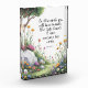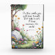 Dans un jardin d'imaginaires capricieux, un sentier sinueux traverse des fleurs vibrantes. L'inscription de Jean 16:33 : "Dans ce monde, vous aurez du mal. Mais prends coeur ! J'ai surmonté le monde." L'image invitation les visiteurs à réfléchir, leur rappelant que les défis font partie du voyage, même dans un domaine d'émerveillement, mais l'espoir l'emporte.
