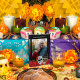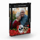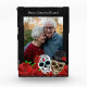 Elégant bloc photo cadre noir décoré d'un lit de roses rouges vintages et d'un crâne à sucre le coupler au fond. avec personnalisation de votre nom ou de vos noms défunts.