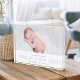 Un bloc photo pour bébé simple et moderne comprend votre photo préférée horizontale ou orientée paysage, avec une bande blanche sur le bas de la page "l'amour au premier regard" en gris clair, flanquée du nom et des statistiques de naissance de votre petit. Un design moderne et minimaliste neutre pour les femmes qui fait un cadeau parfait pour les nouveaux parents.