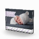 Ajoutez votre photo de nouveau-né orientée paysage préférée à ce bloc photo en acrylique moderne pour une façon unique de se souvenir et d'afficher l'arrivée de votre bébé. Le design présente le nom de votre petite fille, sa date de naissance et ses statistiques de naissance sur une bannière de ruban lavande pâle, avec une bordure inférieure de bandes diagonales en blanc, gris pâle et lavande.