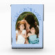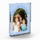 Modern and minimal family memory photo block featuring a photo in a arch frame with a text that says "Love Grows Here" with tiny hearts. Icy blue.