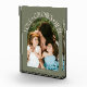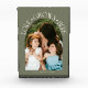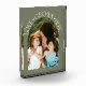 Modern and minimal family memory photo block featuring a photo in a arch frame with a text that says "Love Grows Here" with tiny hearts. Sage green.